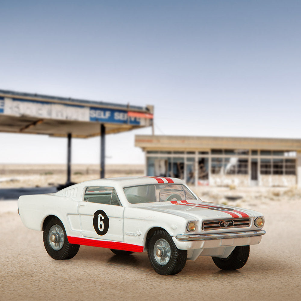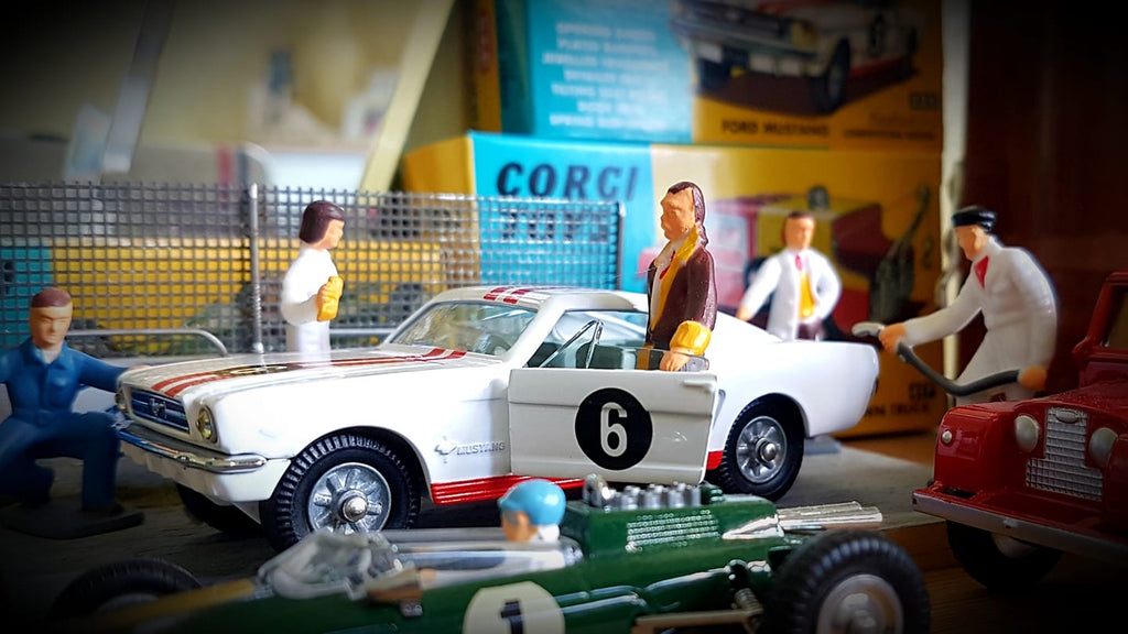 Based on the slightly earlier ‘non-competition’ CorgiFord Mustang, number 320, which was launched in April 1965, this new motor racing version was in the shops just in time for Christmas. Both models were given a host of features such as opening doors and tilting seats – all very innovative for the time. With a sleek white body and twin red bonnet stripes, this new racing model sensibly omitted the previous version’s small plastic corgi dog on the parcel shelf.