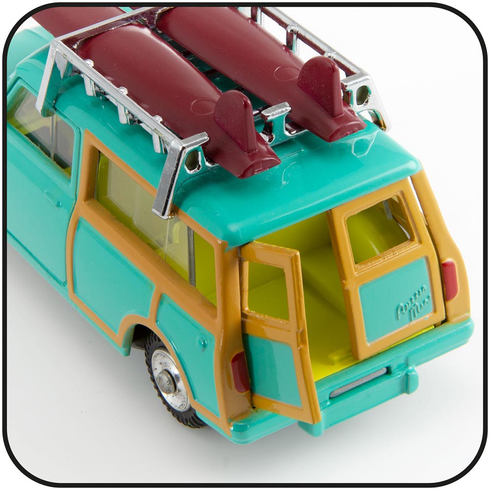 Nicely made model complete with mini tanned surfer! Inspires me to put on a beach boys album and go cruising! Dig that cool green color with faux wood paneling….