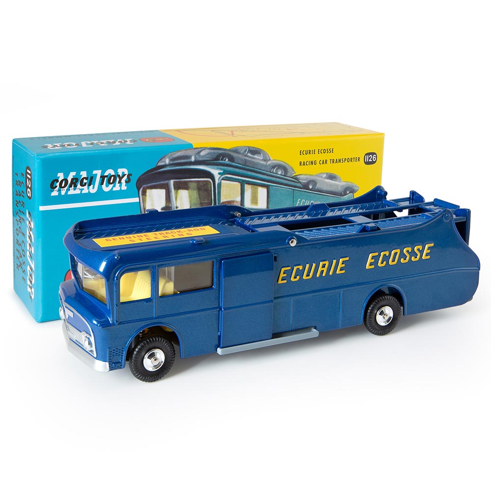 Originally introduced into the Corgi range in October 1961, Corgi 1126, the Ecurie Ecosse Racing Car Transporter, is one of the most desirable die-cast models of its era. Featuring two decks, allowing three racing cars to be transported, the model also features a workshop, complete with benches and a miniature vice – all visible via a sliding door.