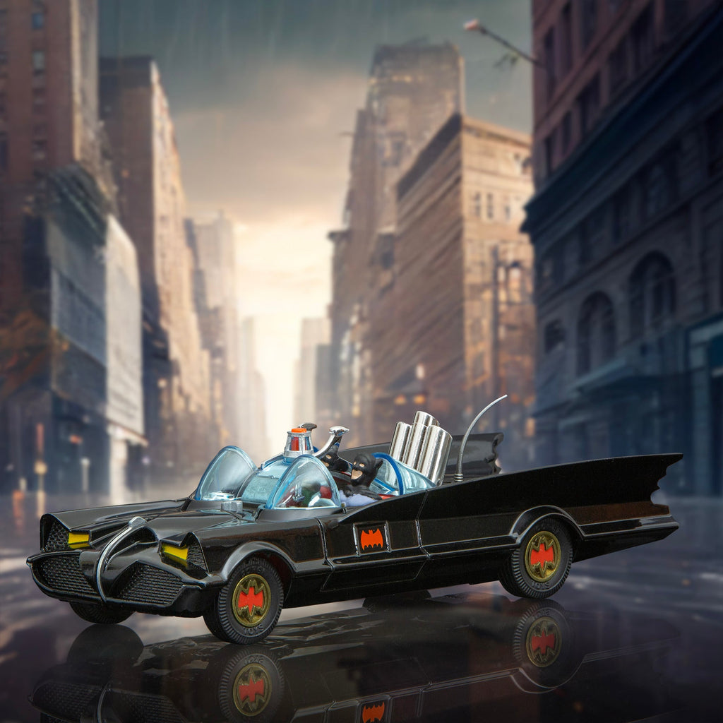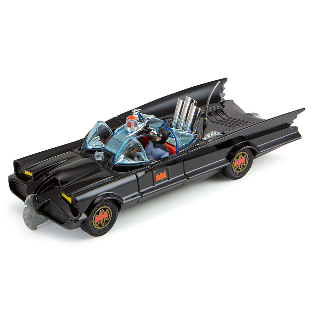 The Batmobile was introduced into the Corgi range after the popularity of the 1966 Batman TV series starring Adam West (as Batman) and Burt Ward (as Robin). With a wealth of features – notably a triple rocket launcher armed with small plastic missiles, a front-mounted pop-out chain cutter and a turbo exhaust flame that pulsed in and out – the model was an instant success and has since achieved legendary status among collectors.
