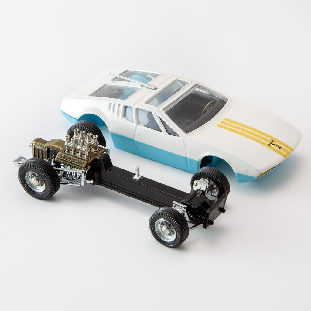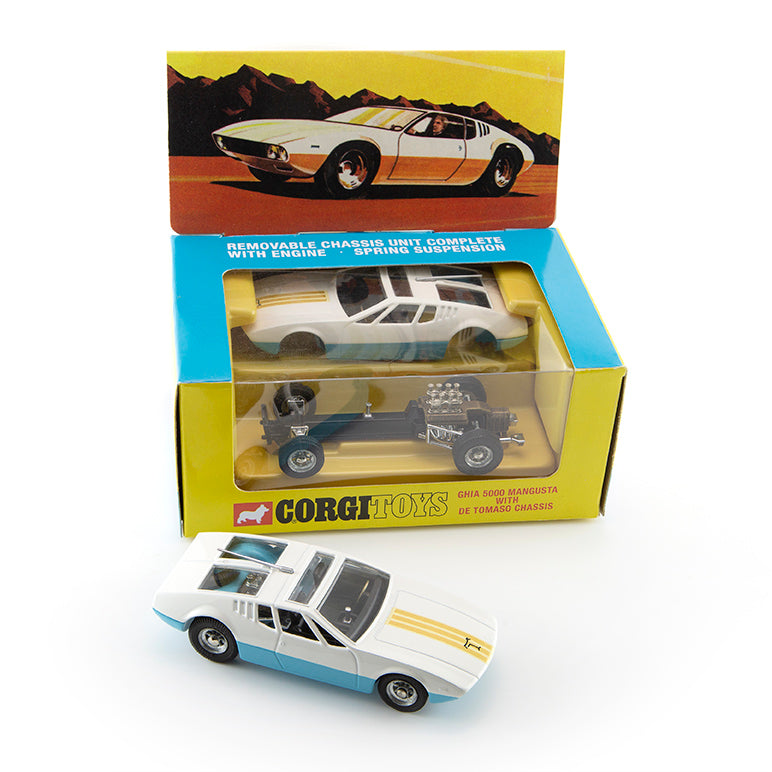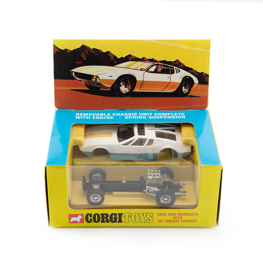 As the 1960s morphed into the 1970s, Corgi continued to introduce innovative features, most notably on a selection of models featuring a removable chassis. The Italian Ghia 5000 Mangusta with a De Tomaso chassis was an ideal subject – Ghia famous for their streamlined bodies and De Tomaso for their engine and chassis combinations.