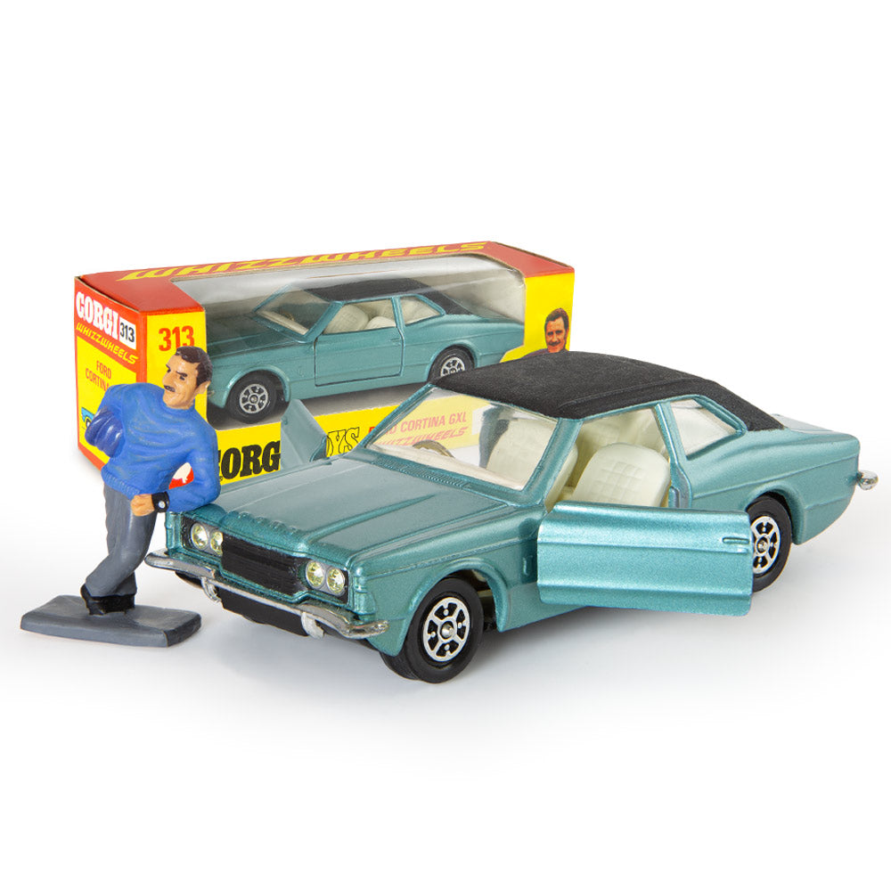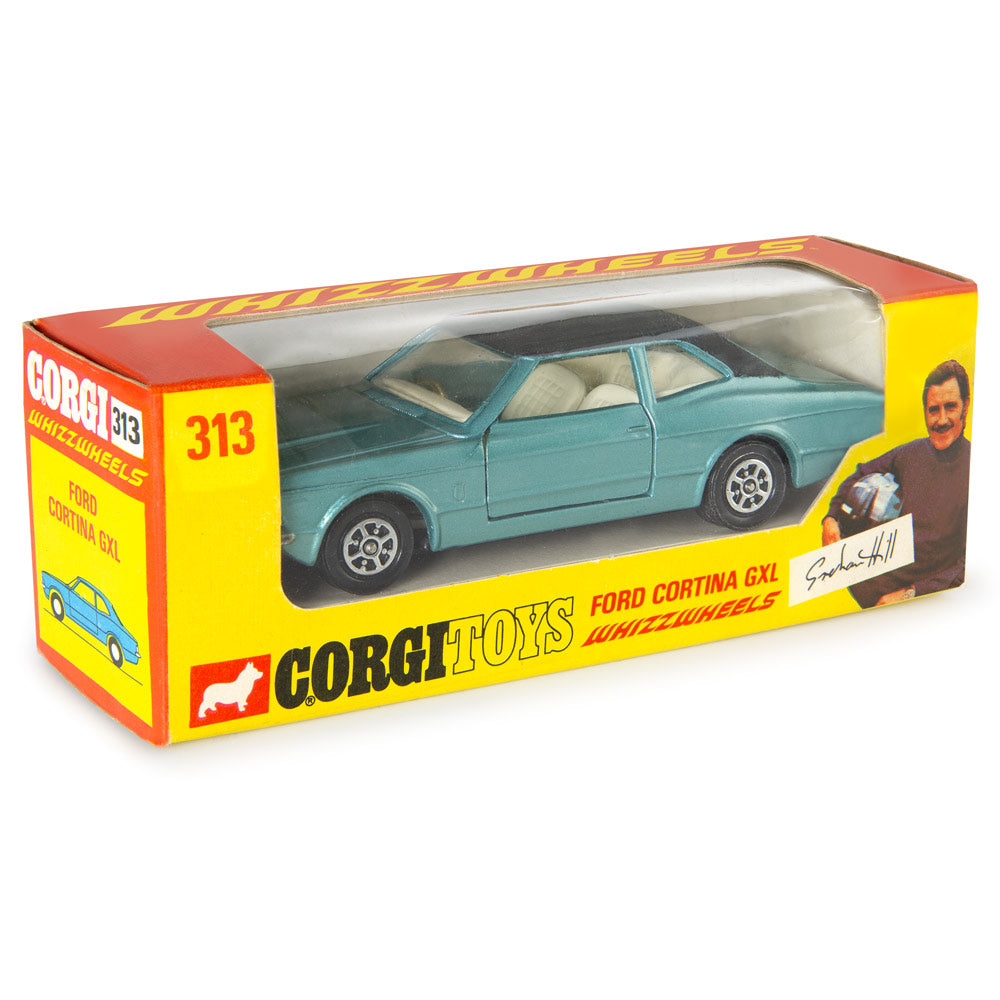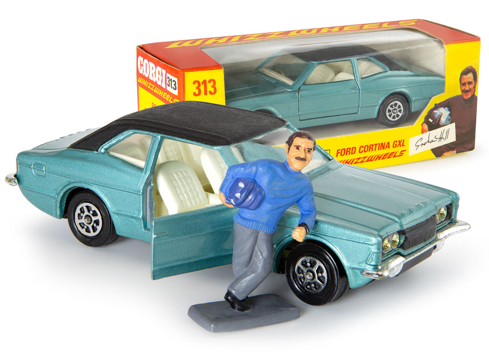 This perfect die-cast replica of Graham Hill’s Ford Cortina – which comes complete with a characterful figure of the great man himself, and the authentic 1971 Whizzwheels box packaging.  Opening doors, tilting seats, detailed interior and Graham Hill figure which casually leans on the car's bonnet.